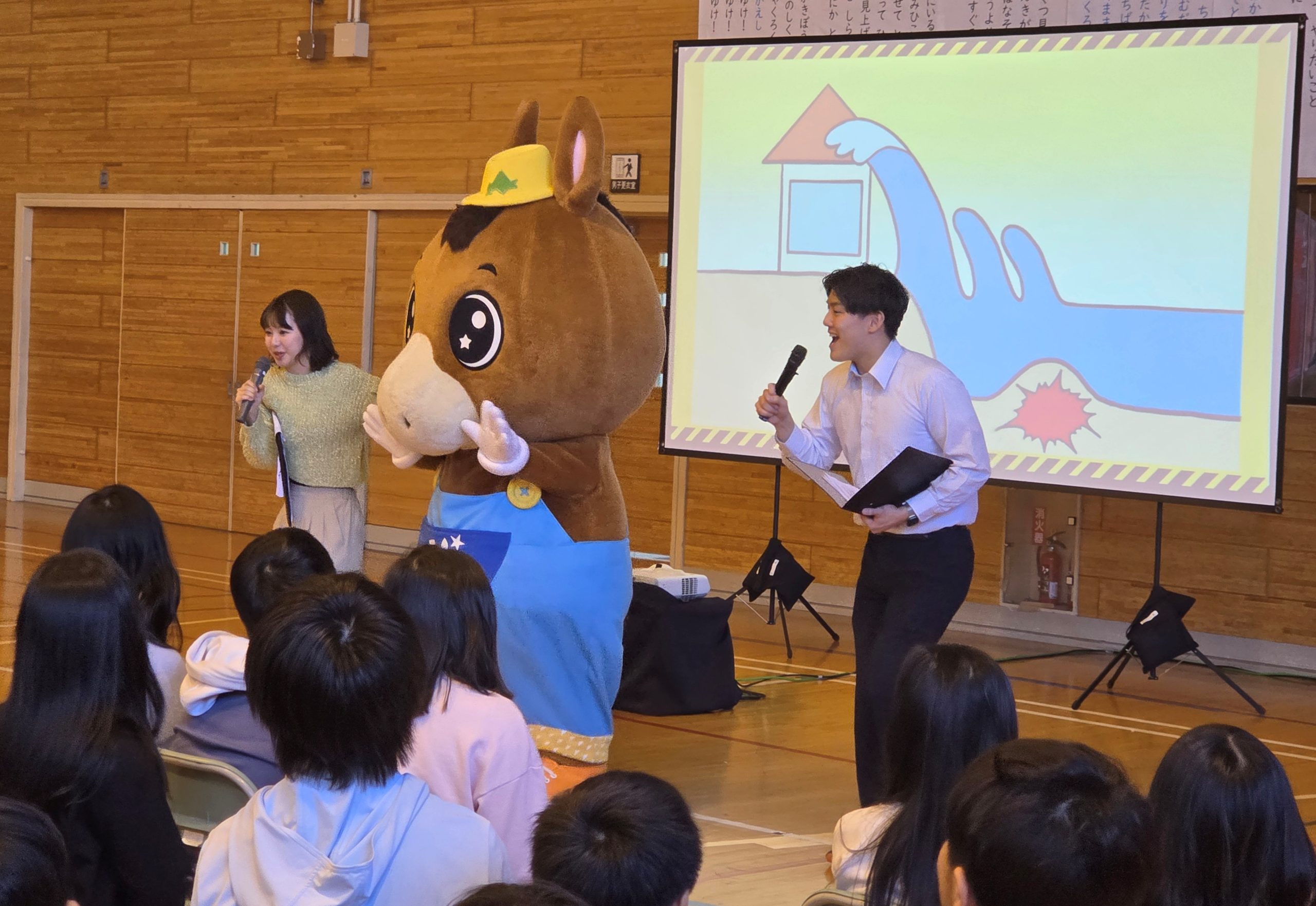 大地震に伴う津波は大森浜小学校、湯川小学校にもやってくることが予想されていて、どさんこくんと一緒に津波の速さや高さを学んでもらいました。